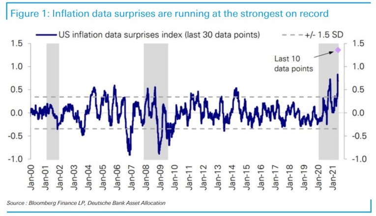 The chart shows U.S. inflation data surprises at their highest in the 20-year history of the series, said strategist Jim Reid, referring to a note by equity strategist Parag Thatte. The last 10 data points were “almost off the chart,” he noted.