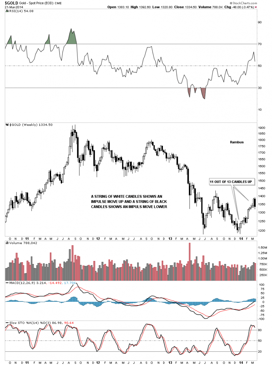 This next chart shows where the green 65 wma and the most recent high touched, red arrow. That 65 week moving average always worked as support during the bull market years. Is it now going to reverse its role and act as resistance during the bear market? Sometimes it can be too painfully easy not to pay attention to something, as simple as a moving average, that worked miracles during the bull market years. Sometimes it can be that easy. Also if this is the 4th reversal point in the red triangle we are catching it at the optimal time to take advantage of a move down to at least the bottom red rail. If gold can takeout the top red rail and the 65 wma to the topside then we’ll know right away that gold is much stronger than what it appears right now.
