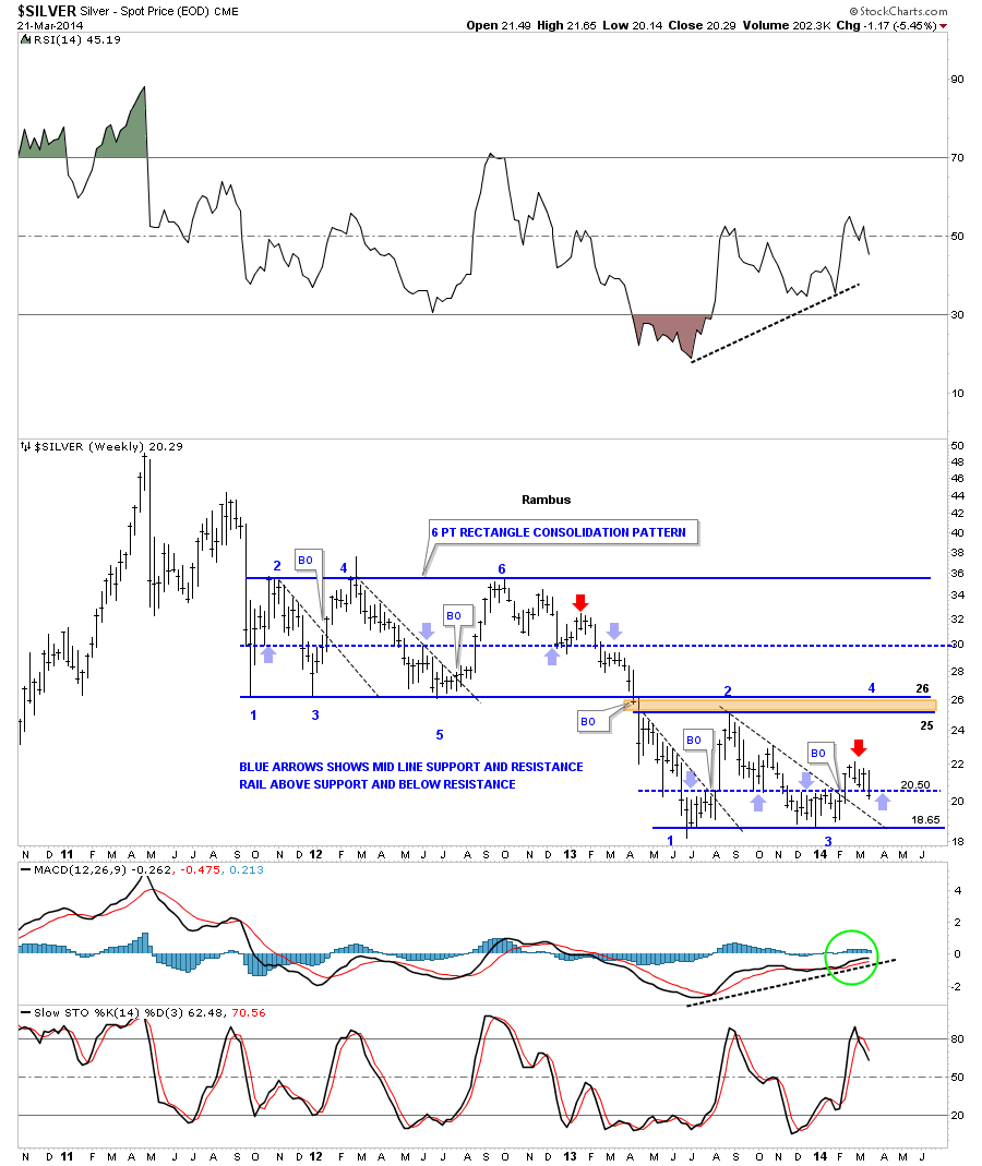 Below is another weekly chart I’ve been showing you that has the lite blue arrows that shows the mid rail support and resistance areas. As you know I’ve been watching that 20.50 area like a hawk hoping it would hold support. As you can see it closed the week below that critical mid line of support. I’ve added a red arrow that shows what happened the last time the center rail failed to hold support on the 6 point rectangle consolidation pattern above. That red arrow, on the blue 6 point rectangle, is the actual spot that began the big impulse leg down to eighteen. Is our current failure to hold support at the center dashed line the actual beginning of the next impulse leg down similar to what we seen on the blue rectangle?