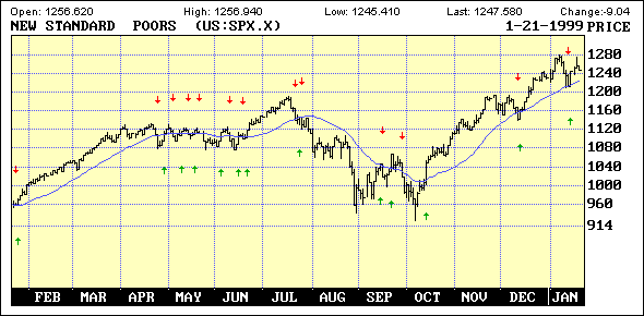 It might also be of interest that most of our core stocks were also retained similarly throughout 1997 and (where they existed) in 1996. Some were bought in 1996, and this is not the overall list. Also; and maybe this is more interesting, these aren't even the best performers in our list for the last part of 1998, where they did great, but InfoSeek (SEEK), EarthLink (ELNK) and a few others like Comcast (CMCSA), Intel (INTC), Texas Instruments (TXN) and Time Warner (TWX) also excelled, and should be recognized. Also, Netscape (NSCP) and Rambus (RMBS), not in the S&P, beat all of these. Rambus particularly, since it was a short from 80, covered in the 40's and bought in the 30's, and pushing 100 at yearend. (Remember part of this has been sold, and that the easy money in Rambus, which is about 300% if you include the short, has been made.) (We advertise our service in the media very little, because we don't need to. Word-of-mouth between investors and brokers tends to increase our readership. We do appreciate it. And our sincere thanks for all the kind words after last year's forecast debacle, regarding many portfolios saved from disaster. We are rarely super upside-cheerleaders as some are, so even when bullish we're looking for lurking risks. At the same time, we're always net long, with history showing that the key is not getting creamed during the breaks.)