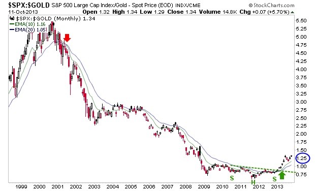The following is excerpted from the October 13 edition of Notes From the Rabbit Hole. The segment followed a review of NFTRH’s big picture stance on gold vs. various assets positively correlated to the global economy. Specifically, the previous segment concluded that yes, the NFTRH big secular view is under threat by a technical analysis signal favoring US stocks over gold on the big picture per this monthly chart of SPX-Gold. NFTRH first began managing this as the bottoming pattern broke above its neckline and then the EMA 10 crossed above the EMA 20 for the first time since 2001.