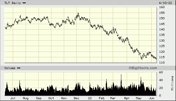 The decline in bond prices (and rise in interest rates) has been in force since early 2020. From a low of just over 1% in the summer of 2020, the interest rate on the US Treasury 20YR bond has more than tripled (1.06% to 3.45%) and the underlying bond price has declined by thirty-eight percent.