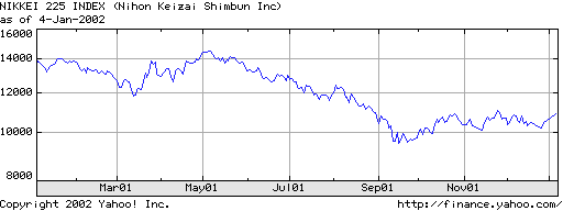 After nearly 12 years of decline, Japan's Nikkei index won't have it quite so bad as other Asian markets this year. The Nikkei was down 31 percent in 2001 but is up 12.36% since September 21 (the global bottom of the dominant interim cycle). The Nikkei's cycle channels are sideways with a minor upward slope early in 2002 but should turn down slightly later on this year when the force of the dominant trading cycle bottoms in October.