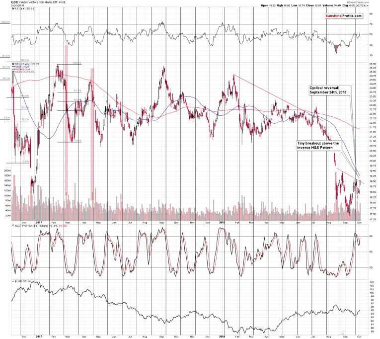 Yes, they are, but if the breakout is so tiny as the one that we saw in GDX yesterday, then it has to be confirmed, before one can really speak of bullish implications. So, sorry, but the outlook didn’t really improve based on the above-mentioned breakout. And since the GDX ETF just moved to the previous highs, there’s really nothing else that we can say about the above chart – not much changed.