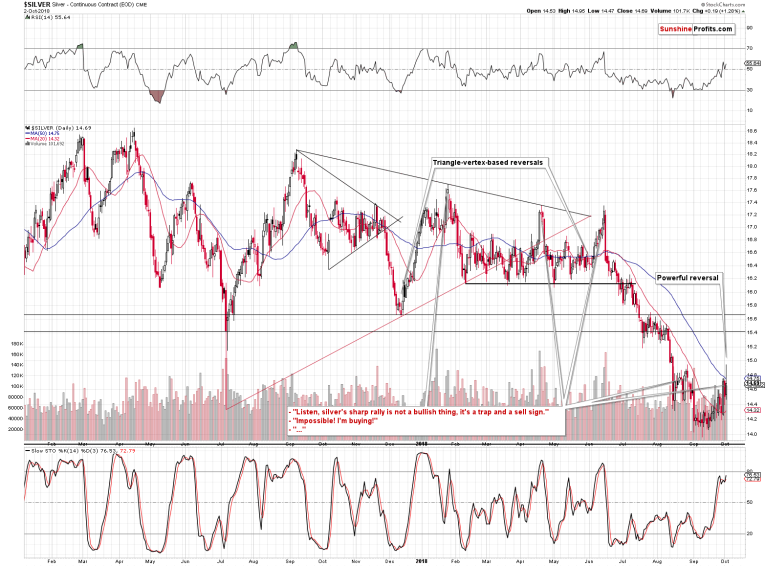 Gold moved higher and the volume was significant. Right. But, what does it change? Did the price increase to the levels that imply a change? Was there an important breakout? Did we see an invalidation of a breakdown? No. Nothing like that happened. Gold moved temporarily above its 50-day moving average and it didn’t even move to its late-August highs.
