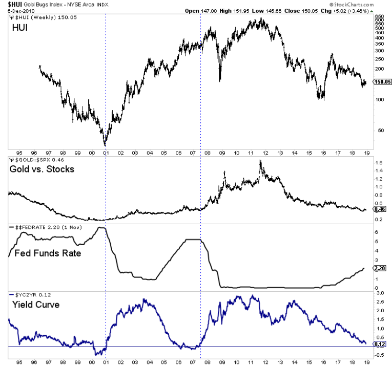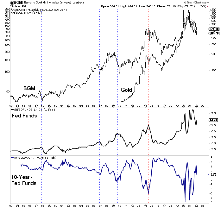 In the chart below we plot the Barron’s Gold Mining Index (BGMI), gold, the Fed funds rate (FFR) and the difference between the 10-year yield and the FFR (as a proxy for the yield curve).