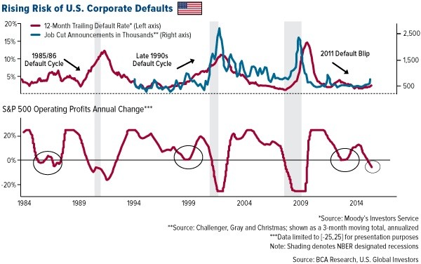 - The corporate sector could cause trouble for the U.S. economy as profits are contracting on a year-over-year basis. What’s more, every contraction in profits since 1980 has coincided with a rise in the corporate default rate. The default rate also closely correlates with job cut announcements.