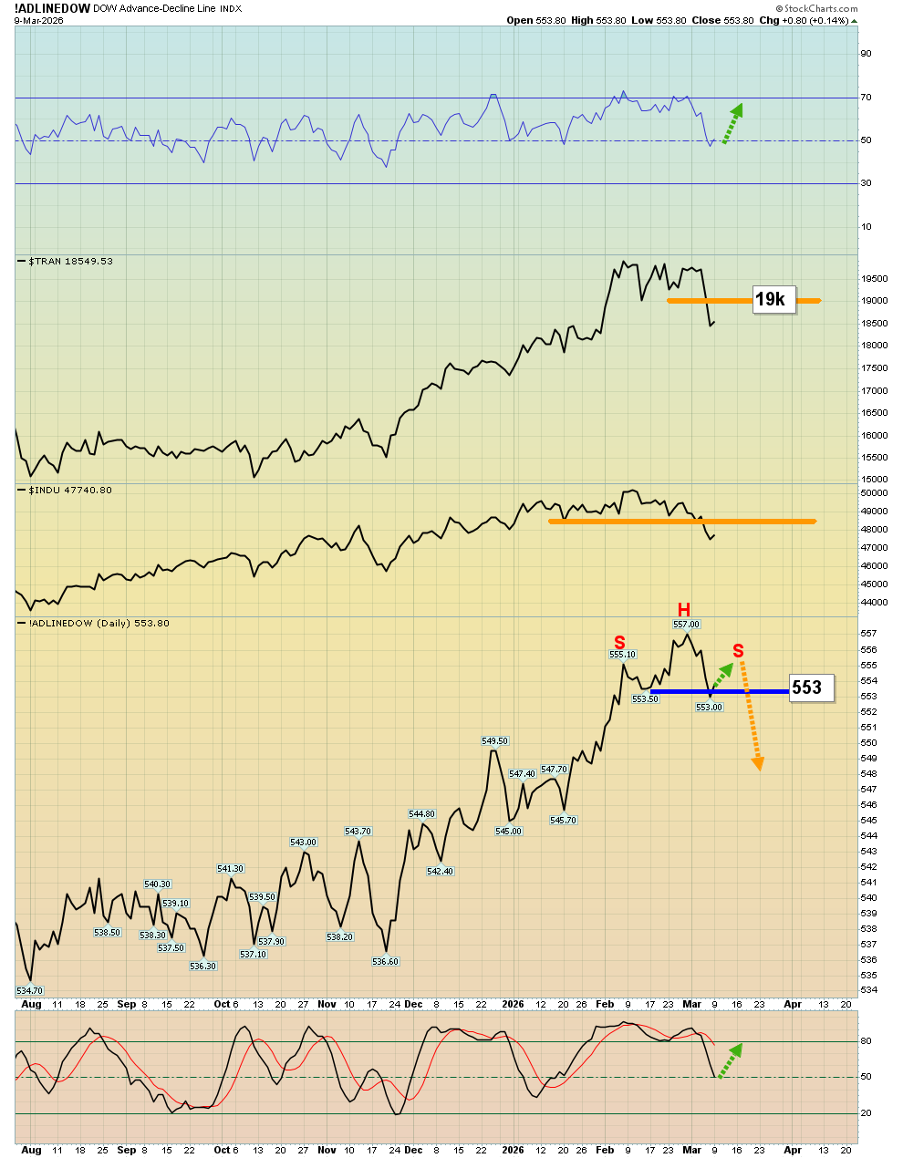 That hasn’t happened… yet. Note the potential H&S top in play on the ADL; 553 is still a big number to watch.