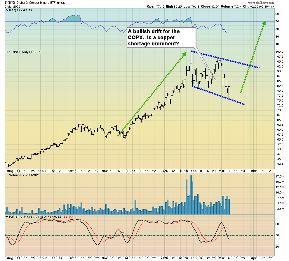 This is the exciting COPX copper stocks chart. A 25% price sale is taking the form of a bullish rectangular drift. If the US government hadn’t faded its Iran war yesterday, oil would be charging towards $200 right now.