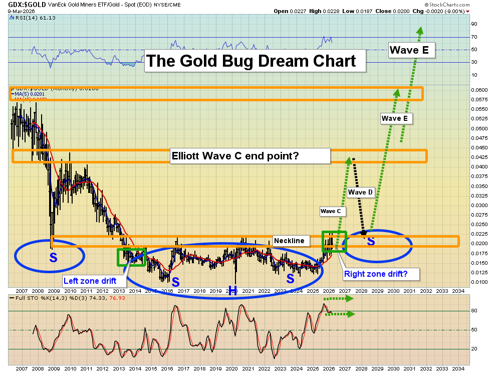 Here's another one of the greatest charts in the history of markets, the GDX versus gold chart. The predicted pause at the neckline of the massive inverse H&S pattern continues to be in play. I’ve suggested that the “true” breakout may not occur until later this year but there’s too much at stake in terms of potential upside to try to top call gold stocks here.