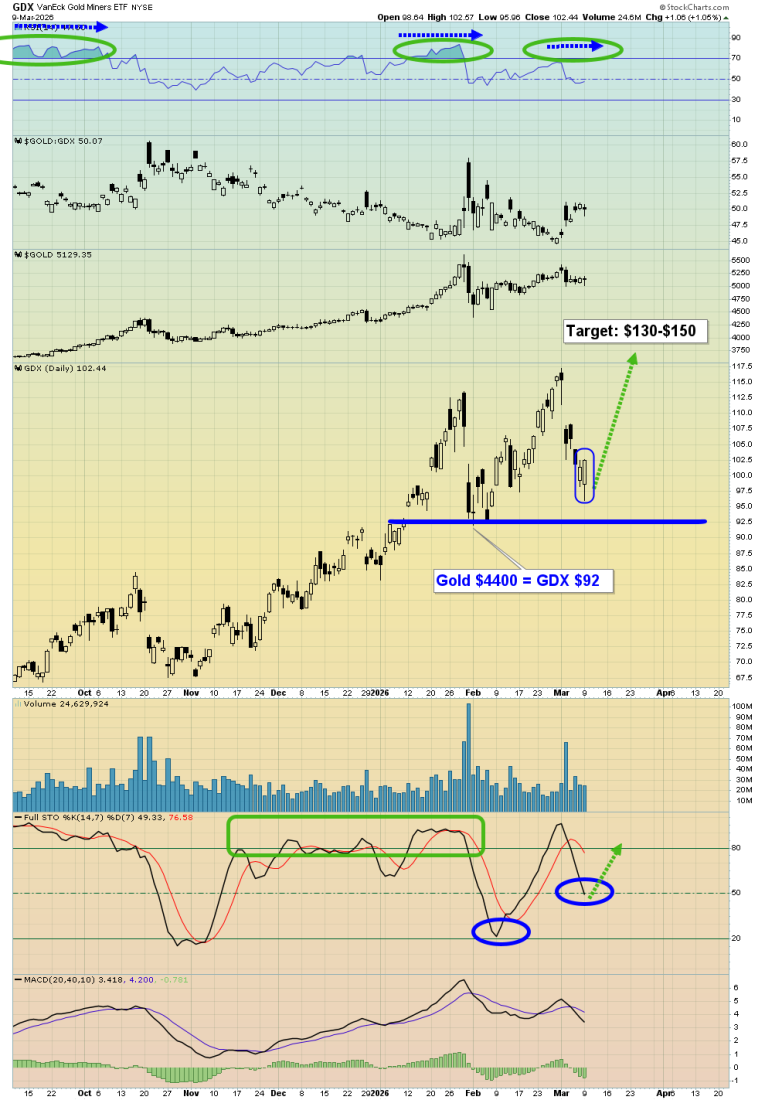 On this daily chart of GDX versus US fiat money, the pause didn’t begin until late January. A surge to $130 is likely to occur within the big GDX versus gold pause zone and…