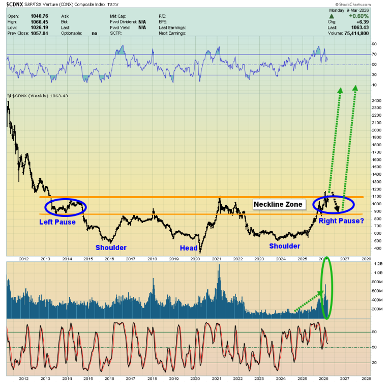 I’ve urged eager mine stock investors to be open to a short-term pause on this CDNX weekly chart… and that’s in play.