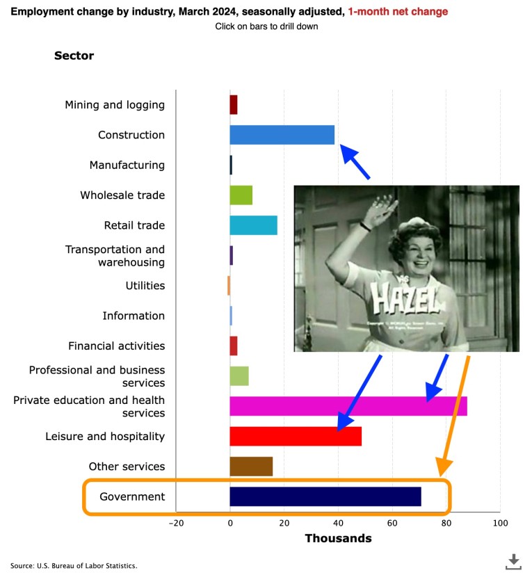 Another payrolls report, another beat of expectations. Here is the breakdown of the details as posted earlier. However, let’s pluck one graphic from that post and illustrate a phenomenon I’ve been watching unfold for several months in a row; that of unabated government hiring this election year.
