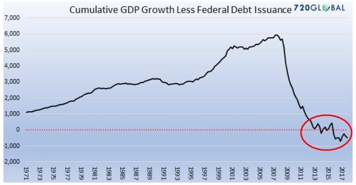 Looking at the chart you will notice from 1971 to 2008, the line was for the most part an upward trajectory. Beginning 2008, you will also notice the line has basically crashed below all years prior to 2008 and is now "negative". For perspective we need to know what "the line" actually represents. Basically it shows net growth of GDP for any given year with the amount of Treasury issued debt subtracted from GDP. For instance, if GDP were to grow by $500 billion over the previous year and the Treasury borrowed a net $250 billion then that year would register a positive $250 billion. Conversely, if GDP grew by $500 billion but the Treasury issued a net $1 trillion, the number registered would be negative $500 billion. Also note this chart is "cumulative" which means the current year is added or subtracted from all the previous years combined.