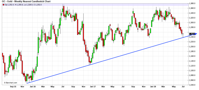 Well, first let's check the long-term weekly chart. Why in May did we suggest $1235 as a possible low? Because that level would mark the extension of the primary, long-term trendline that begins at the bear market lows of December 2015 and extends through the lows of December 2016. An updated chart is posted below, and you should be sure to note that the selling on Monday of this week eased precisely at this line. Additionally, if the weekly candle turns green by the close this Friday, it will likely mark a key reversal. Thus the level to watch through this week is $1255.