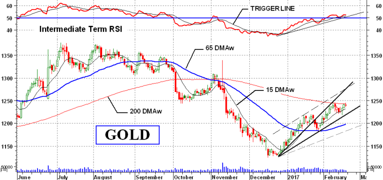 Of some minor concern at this time is the action of the short-term momentum indicator (not shown). Although gold has made higher highs in February versus the high in January the momentum indicator has not been able to perform likewise. It has not made a higher high and is thereby showing a minor negative divergence. This is a short-term warning that should be kept in mind.