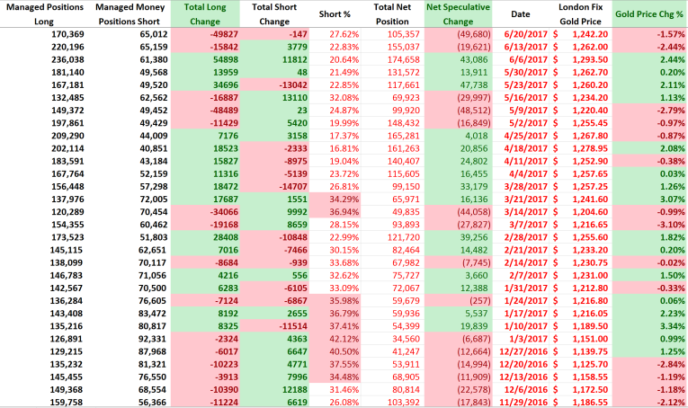 There are many ways to read the COT report, and there are many analysts that focus specifically on this report (we are not one of them) so we won't claim to be the exports on it. What we focus on in this report is the "Managed Money" positions and total open interest as it gives us an idea of how much interest there is in the gold market and how the short-term players are positioned.
