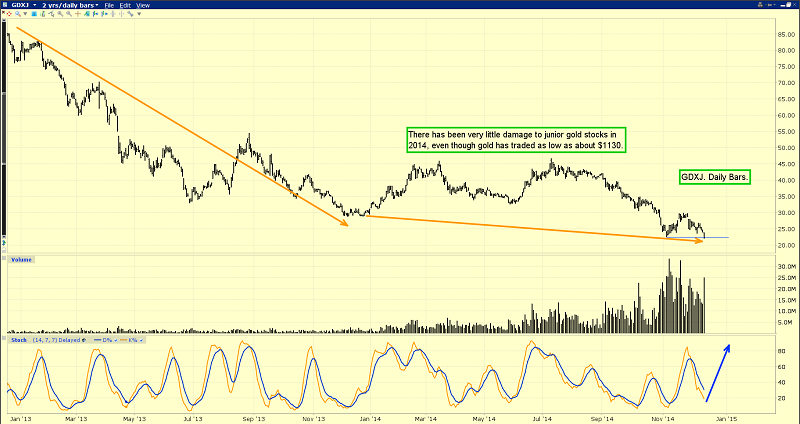 15. That’s the daily GDX chart. It’s clear that volume is shrinking as the second bottom forms. My gold shares position has never been this large, and I’m ready for a fabulous year in 2015.