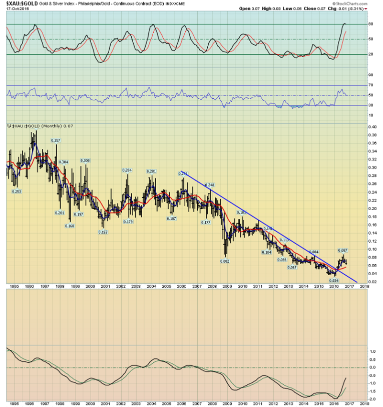 This is the long-term gold stocks versus gold chart.