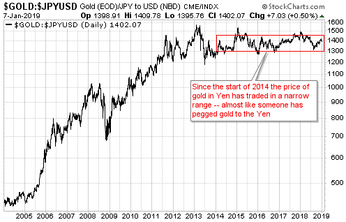 About five months ago I posted an article in response to stories that the Chinese government had pegged either the SDR-denominated gold price or the yuan-denominated gold price. These stories were based on gold's narrow trading range relative to the currency in question over the preceding two years, as if government manipulation were the only or the most plausible explanation for a narrow trading range in a global market. To illustrate the silliness of these stories I came up with my own story - that it was actually the Japanese government that was pegging the gold price. My story had, and still has, the advantage of being a better fit with the price data.
