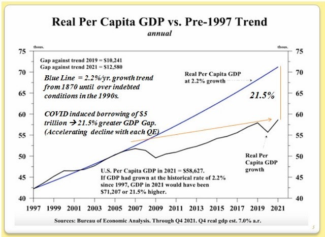 The blue line in the following graphic represents America’s GDP Trend line growth of 2.2% per year dating back to 1870. But with massive money printing then QE in 2008, real GDP started slowing dramatically, as the black line illustrates. Then, as the Fed printed massive amounts of money into the system to keep rates low (because the system couldn’t handle higher rates), funded by Federal borrowings, by the time COVID related policy rolled around, real GDP (black line) fell 21.5% below trend GDP. Instead of per capita GDP being $71,207 it was only $58,627 GDP in 2021. What the various academic studies revealed by Lacy Hunt demonstrated was that after debt/GDP rises beyond 60%, additional debt-funded expenditures by government start to lead to declining GDP in a non-linear manner. And once debt/GDP rises above 90% for at least five years, economic growth slows very dramatically. Their study covered 26 historical major public debt overhang episodes in 22 advanced economies that had debt/GDP ratios greater than 90%. The conclusion of the Gold study was: (1) The economic growth rate is reduced by slightly more than one-third, and (2) When debt/GDP is greater than 90%, rates are not likely to rise, even when tighter monetary and fiscal conditions are implemented.
