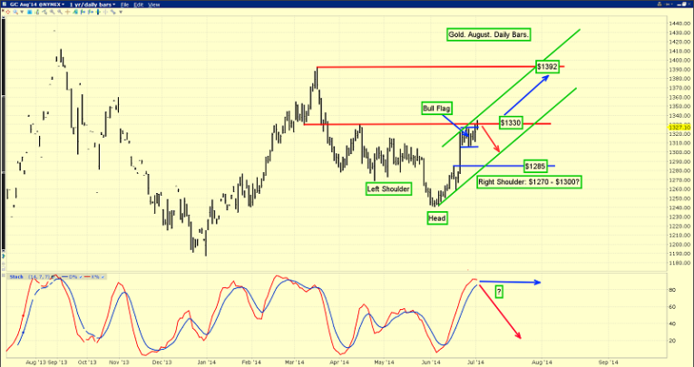 I’ve highlighted a bull flag pattern breakout on this daily gold chart. Even if the flag pattern fails, and the 14,7,7 Stochastics oscillator suggests it could, that failure would likely create a powerful right shoulder, completing a bullish inverse head and shoulders bottom pattern.