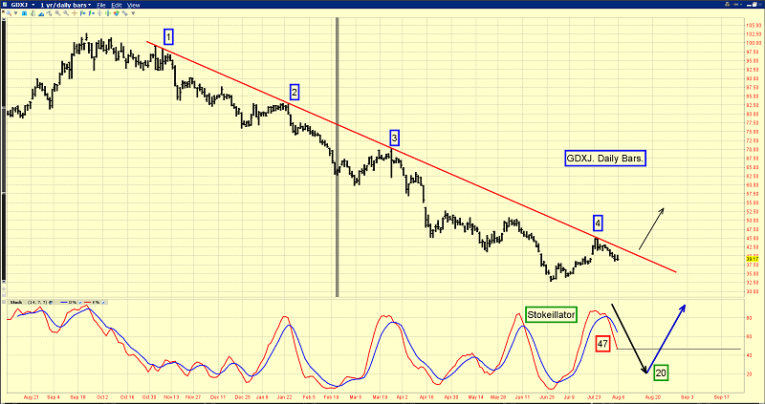 You are viewing the GDXJ daily chart. From a technical point of view, the more times that the price touches a downtrend line, the more important an upside breakout becomes.