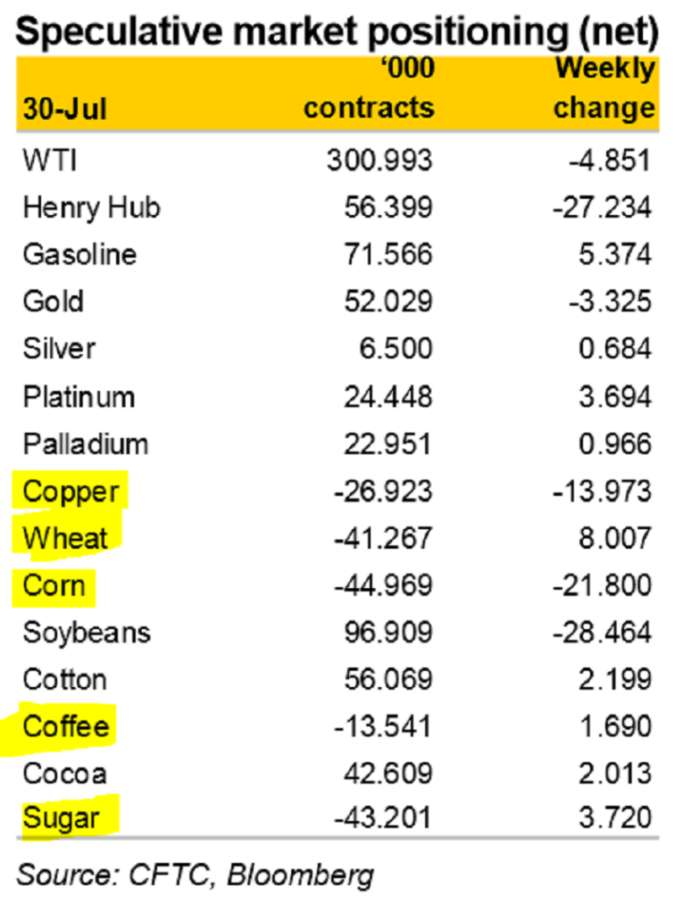 You are looking at a Bloomberg/CFTC table of speculative positions in various commodity markets. Speculators clearly have huge net short positions in five commodities, but not in gold or silver.