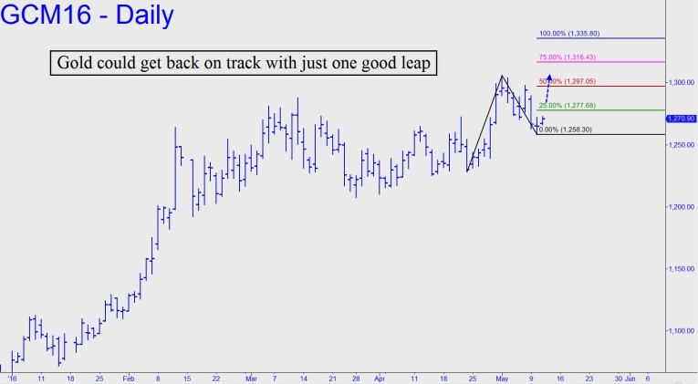 Bulls barely kept their heads above water Tuesday and will have their work cut out for them if they are to avoid a dunking. That would require a print at 1277.80, a mere $7 above current levels. The most bullish scenario I could imagine at the moment would be a thrust over the next two days exceeding the 1297.05 midpoint Hidden Pivot of the pattern shown. That would steepen the trajectory of the rally since mid-February while presumably quieting the bearish buzz that seems to attend every bout of weakness lasting more than three days.