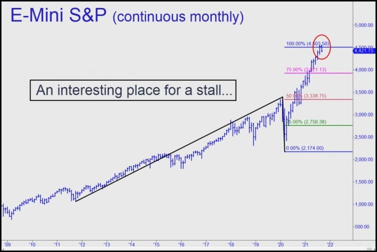 For now, don't believe talking-heads blather about how Black Rock, Goldman Sachs et al. hold only relatively small stakes in Evergrande. The truth is, when you connect up the dots, toting up derivatives exposure tied to Evergrande's epic real estate portfolio, they are all in it up to their eyeballs. In the meantime, traders and investors should treat every rally as a gift, and every Wile E. Coyote pause in selling as an anomaly. The tempo of the selling is certain to accelerate, and short-squeeze rallies to grow more violent; it will be increasingly difficult to get short. But there should be little doubt that bears have finally got the wind at their backs. The chart above shows that they have some technical support as well, in the form of an E-Mini S&P top at a 4503 Hidden Pivot rally target that has been a decade.