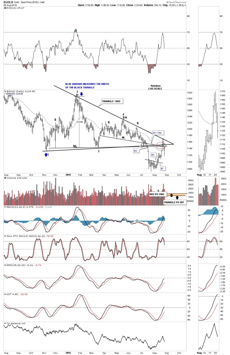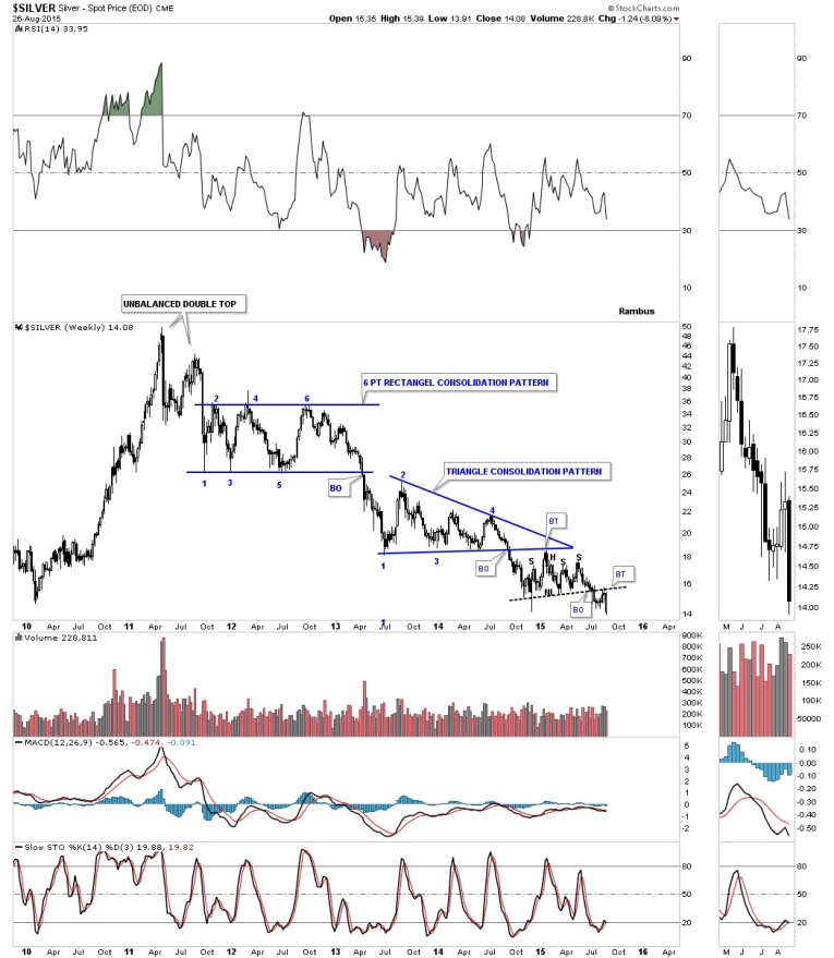 This next chart for gold is a daily line chart which shows the massive 2 1/2 year bearish falling wedge with the blue triangle / H&S consolidation pattern that formed out toward the apex. This daily line chart shows the counter trend rally stopped dead in its tracks at the neckline and the apex of the blue triangle. At this point I’m calling this counter trend rally just a strong backtest to the bottom rail of the 2 1/2 consolidation pattern until something says differently.