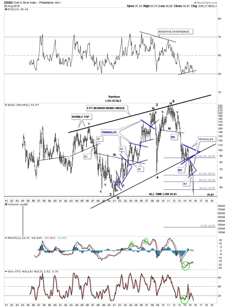 Next I would like to show you a couple of long-term charts for the $XAU that shows where we may look for a price objective for this next impulse move lower. This first chart shows you the entire history of the XAU which is showing us a massive bearish rising wedge formation. I would like to focus your attention to the bottom rail of the massive rising wedge which shows us one blue triangle consolidation pattern above the bottom rail and one below. I have talked about and shown you many cases of setups like this. You’ve heard me say if you see a consolidation pattern above an important trendline, or below and important trendline, or one right on an important trendline or one above and one below and important trendline that is usually a very good setup. Here we see one above and one below that very important 15 year bottom trendline. The XAU is now just several points away from making brand new all-time lows. Pretty amazing when you think about it. Also note the big reversal patterns that have played such a key role during the formation of this nearly 35 year monthly chart. Big reversal patterns big moves. I got a price objective by measuring the width of the huge bearish rising wedge which shows a price down to the 23.63 area.