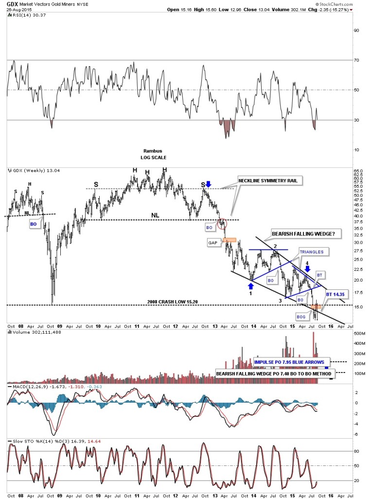 Next we’ll look at a weekly chart for the GDXJ which shows its entire history complete with its massive H&S top and a slightly different bearish falling wedge. The GDXJ’s bearish falling wedge is made up of six reversal points and has a price objective down to the 6.50 to the 7.50 area.