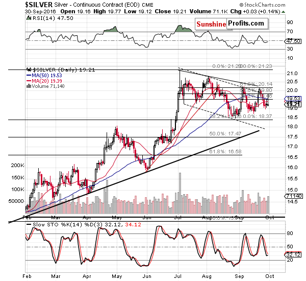 In terms of turning points, we get the same bearish implications. It “was about time” for silver to change its course and the thing was that we saw a decline instead of a short-term rally. That was a problem because, in general, the trend remains down, and the implications of the turning point after a decline would be bullish. It all changed based on silver’s intra-day rally. We now have silver after an intra-day rally and it seems that the next move will be to the downside.