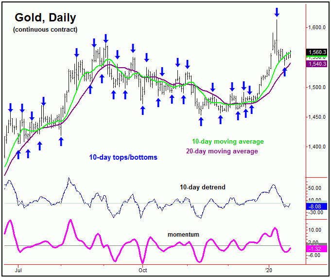 Stepping back, the next peak for the 72-day wave is likely to end up as the price top for the larger 310-day cycle that we track. Once the combination of these waves do top out, gold should see another drop back to or below it's rising 72-day moving average - though with a decline back to the 310-day moving average being more ideal. The latter moving average is currently at the 1491 figure (February, 2020 contract) - though it should be at much higher levels by the time that the next 72/310-day trough forms.