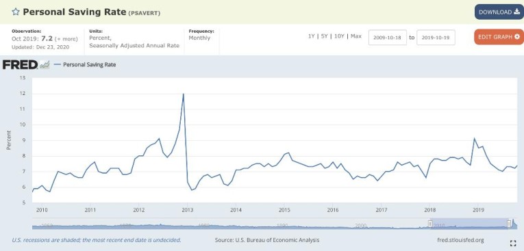 The mirroring of Chapwood and M3 broad money as deflators suggests that there has been little alteration in the general level of liquidity in the hands of consumers, otherwise they would show some divergence. As an approximation, other than a brief spike in 2012 the savings rate has remained reasonably constant over the period, as shown in the screenshot below.