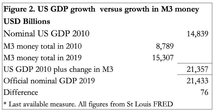 For confirmation of the assertion, that an increase in GDP is no more than the addition of inflated money, we turn to Figure 2, which covers the same period in Figure 1: i.e., 2010 to the end of 2019. There is almost no difference between the sum total of 2010 GDP and the increase in broad money, and the GDP statistic for 2019.