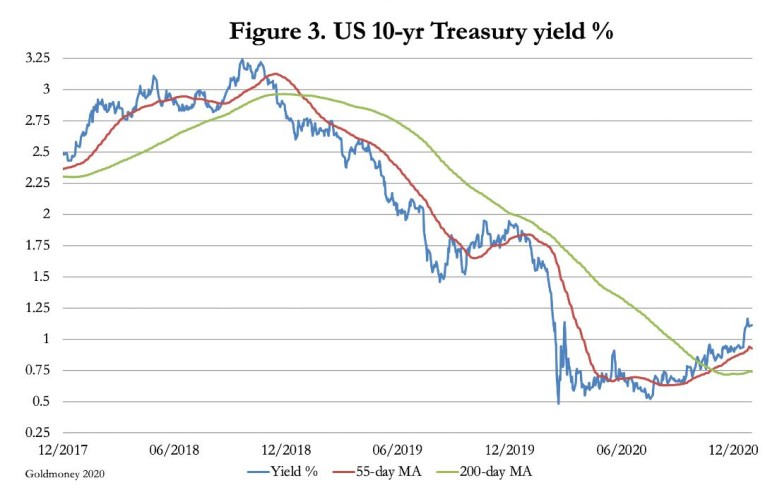 This brings us to interest rates. It seems inconceivable that through this inflationary process markets will continue to believe the CPI numbers — the emperor’s lack of clothing is likely to be pointed out by some child, perhaps an Austrian one at that. Even before this increasingly certain event, the risk to Keynesian spending plans is already growing in the form of rising dollar bond yields. The latest position is illustrated in Figure 3, of the yield on the benchmark 10-year US Treasury bond.