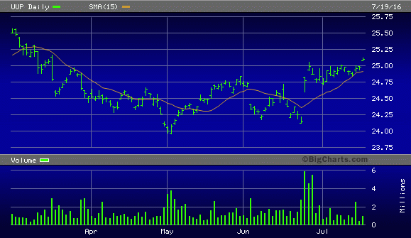 Below is a graph of the PowerShares US Dollar Index Bullish Fund (UUP), an excellent proxy for the US dollar index. UUP is useful since it allows us to see trading volume patterns, particularly since UUP is a favorite of institutional currency traders. The graph shows that UUP has been establishing a short-term base of support above its rising 15-day moving average for the first time this year. The recent breakout attempt above the nearest pivotal chart benchmark at the 25.00 level technically paves the way for a dollar rally, which may in turn create some short-term headwind for equities.