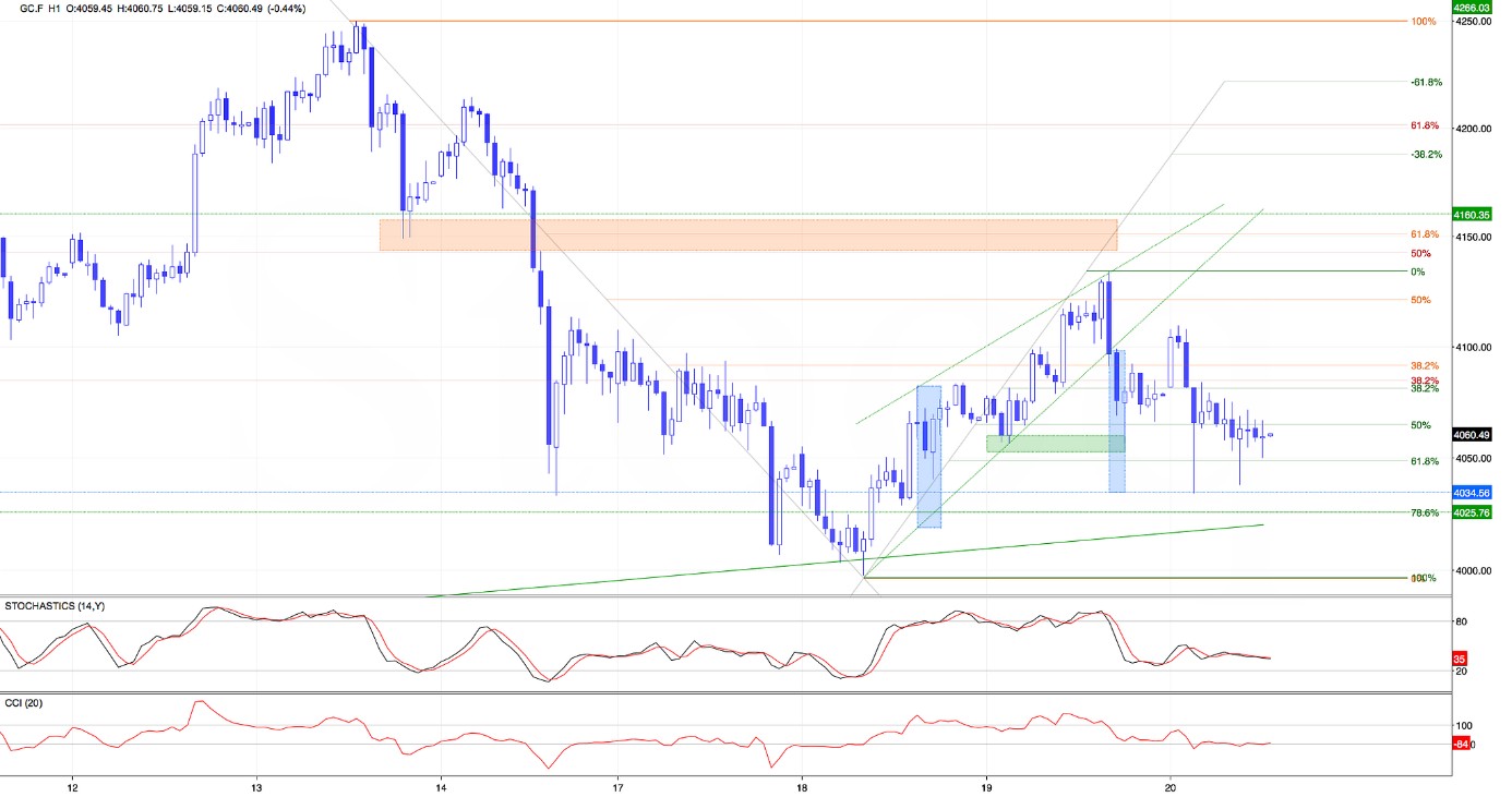 - Gold is wavering just above 4050 after reacting from the green support zone.