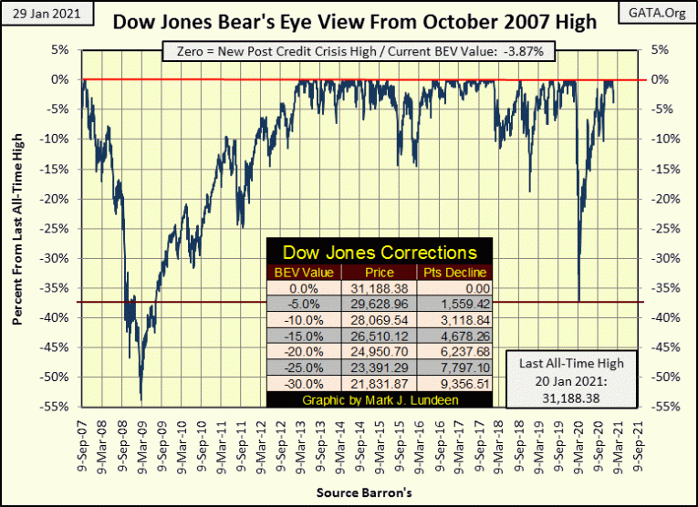 This week for the first time since the November 16th’s all-time high (aka: BEV Zero) the Dow Jones closed more than 3% from a BEV Zero, closing the week down 3.87% from January 20th BEV Zero. It was bound to happen, especially after two and a half months. This is no reason to panic, but it is very noticeable in the Dow Jones BEV chart below.