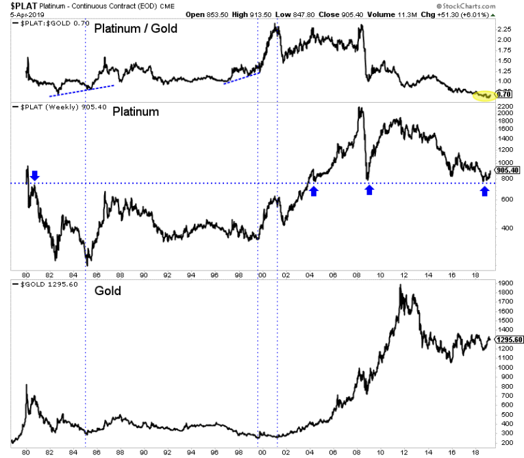 Platinum outperformed and led Gold higher immediately after the two most recent major lows: 1985 and 1999-2001.