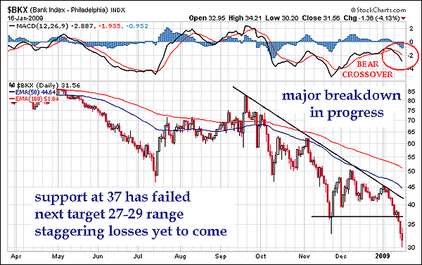 The bank stock index fell hard, precisely as forecasted, exactly as outlined in the brief technical analysis in the last article. It aint done falling. A price target on the decline in progress right now is hard to determine, since the bearish triangle has no well-defined base. But an 8-10 point plunge seems likely, down to the 27-29 range. All claims that the banks have seen their worst days are marketing ploys at best, and moronic actions at worst. Fresh new rounds of mortgage losses come this year. Watch the RKH regional bank stock index, which is also breaking down. The bank sector destruction is broadening beyond Wall Street.