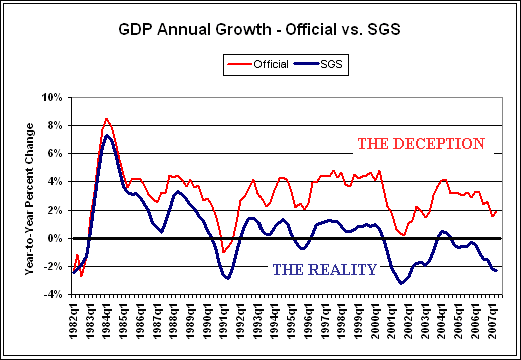 Two clear signals can be identified on the crude oil price front. First, the oil price shot up by 20% in less than two months, a loud gong signal that the USDollar was in danger of an imminent decline. We saw it. Hidden within this signal is the emerging threat of a broader weakening of the PetroDollar defacto standard. Saudi Arabia, Kuwait, and the UAE are each fully engaged in a movement with the Gulf Cooperative Council directed toward abandonment of the US$ peg. The brief pullback in the oil price from 82 to 79 could be only a technical retrenchment before yet higher breakout prices. The energy market without any doubt stands as the most interfered with, the most inefficiently run, and the most easily disrupted in the entire world. Crazy leaders impose their imprints with socialist policy. Brigands raid facilities. Poor investment hampers future supply, when the future appears to have arrived. USDollar supporters use it to finagle vaporous support. The second signal is that a USEconomic recession is gaining credibility, sure to put downward pressure on the oil price. Well, if you rely on accurate statistics, remove silly gimmicks, and dish reality on a cold plate, the recession has been here for some time, with perhaps only one or two quarters out of negative growth since 2001. Deception, distortion, and doctored statistics go hand in hand in reporting economic performance, with fraud and mispricing and false ratings and opaque markets. Since early 2006, the US Gross Domestic Product has fallen steadily. If the true GDP goes to minus 4%, then the official Orwellian nonsensically hedonically elevated GDP will finally register an official recession.