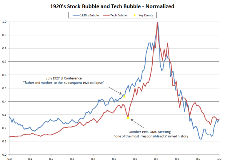At the time of the surprise rate cut the NASDAQ was at 1611. In a little over a year, November 1999, the NASDAQ soared to 2967, a gain of 84%. In a final speculative blow-of the NASDAQ reached 5000 in March of 2000, a 70% rise in just the four months since November, or over 210% since the surprise rate cut sixteen-months earlier in October 1998. As Figure 1 makes clear, the Fed's emergency rate cut in October 1998 had the same effect on stocks as Ben Strong's rate cut after the July 1927 conference of central bankers. There is little doubt that the emergency rate cut of October 1998 sparked the tech bubble in stocks and all that would transpire after this bubble burst.