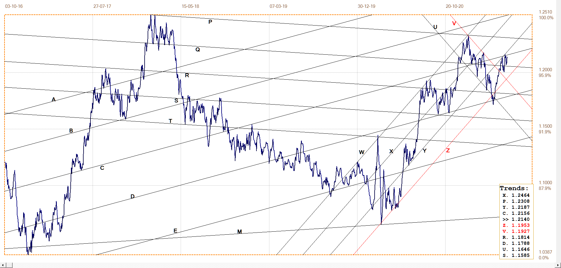 The last rally in the value of the dollar had the euro breaking briefly below its bull channel YZ to also dip below the shallower bull channel CD. The euro recovered from the brief breaks lower to return to channel YZ and reach the top of that channel and then hold below line C. This also resulted in a break above its bear channel UV.