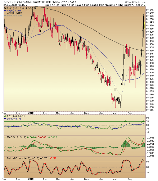 Since we noted the initial move to break the 200 day moving average – and at least temporarily break the downtrend on August 27th – the Silver/Gold ratio (SLV/GLD) has held its breakout, looking to close the week and the month of August on a signal that we have long anticipated.