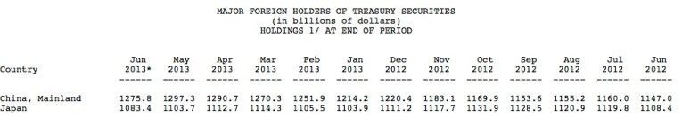 We note that China and Japan had started net selling of T bonds in June just as a ‘would-be’ bottoming pattern became an actual bottoming pattern with a breakout through the neckline. The 3 post-breakout months shown on the chart have featured a heavy rotation of Huey, Dooey and Louie in the media jawboning ‘QE Taper’ ever since.