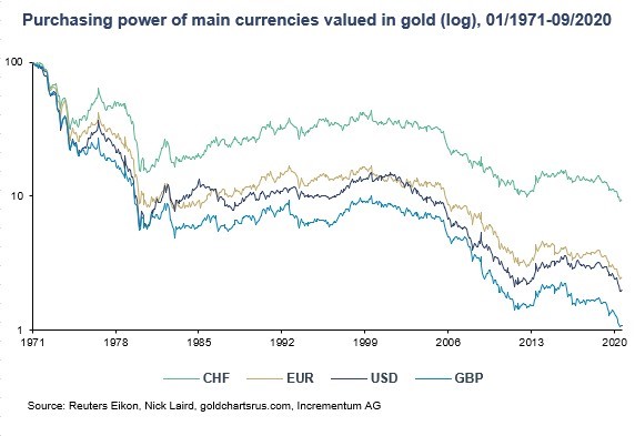 The inherent purchasing power of all major currencies are now tanking by the second when compared against timeless measurements of value like gold.
