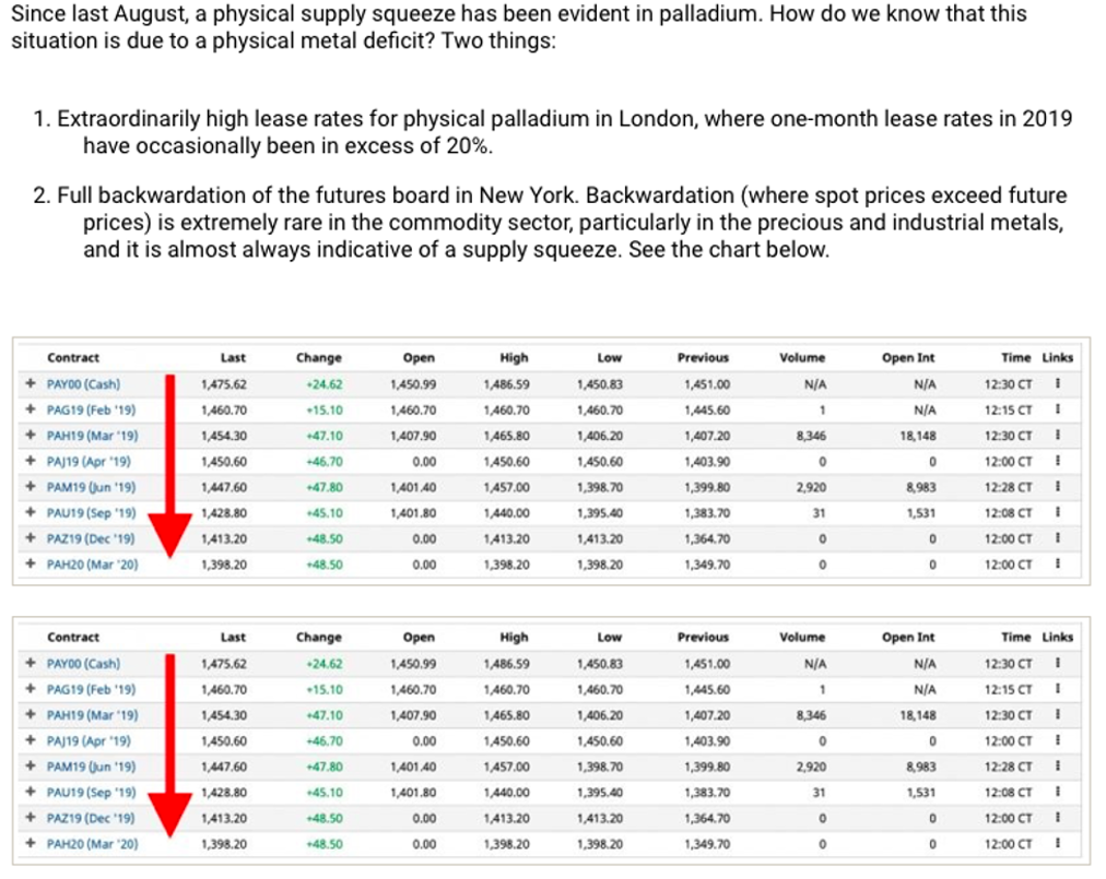Those two conditions were noted in February of last year, and now in January of 2020, the situation has dramatically worsened (for The Banks). First, let's check the current London lease rates. We noted rates as high as 20% a year ago. This was considered outrageous at the time. And now, precious metals expert David Jensen reports that the one month lease rate for physical palladium in London exceeded 36% on Monday, January 20.